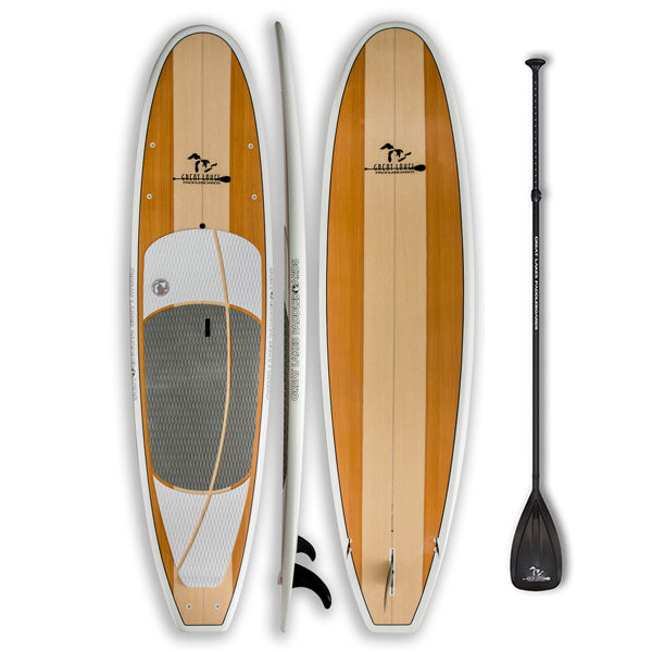 The Woody is our perfect all around SUP. Due to it’s fast shape and tri-fin set-up, you can surf it or you can cruise it with your kiddo or dog. Super stable yet quick and lively….Plus the wood grain is really pretty looking.